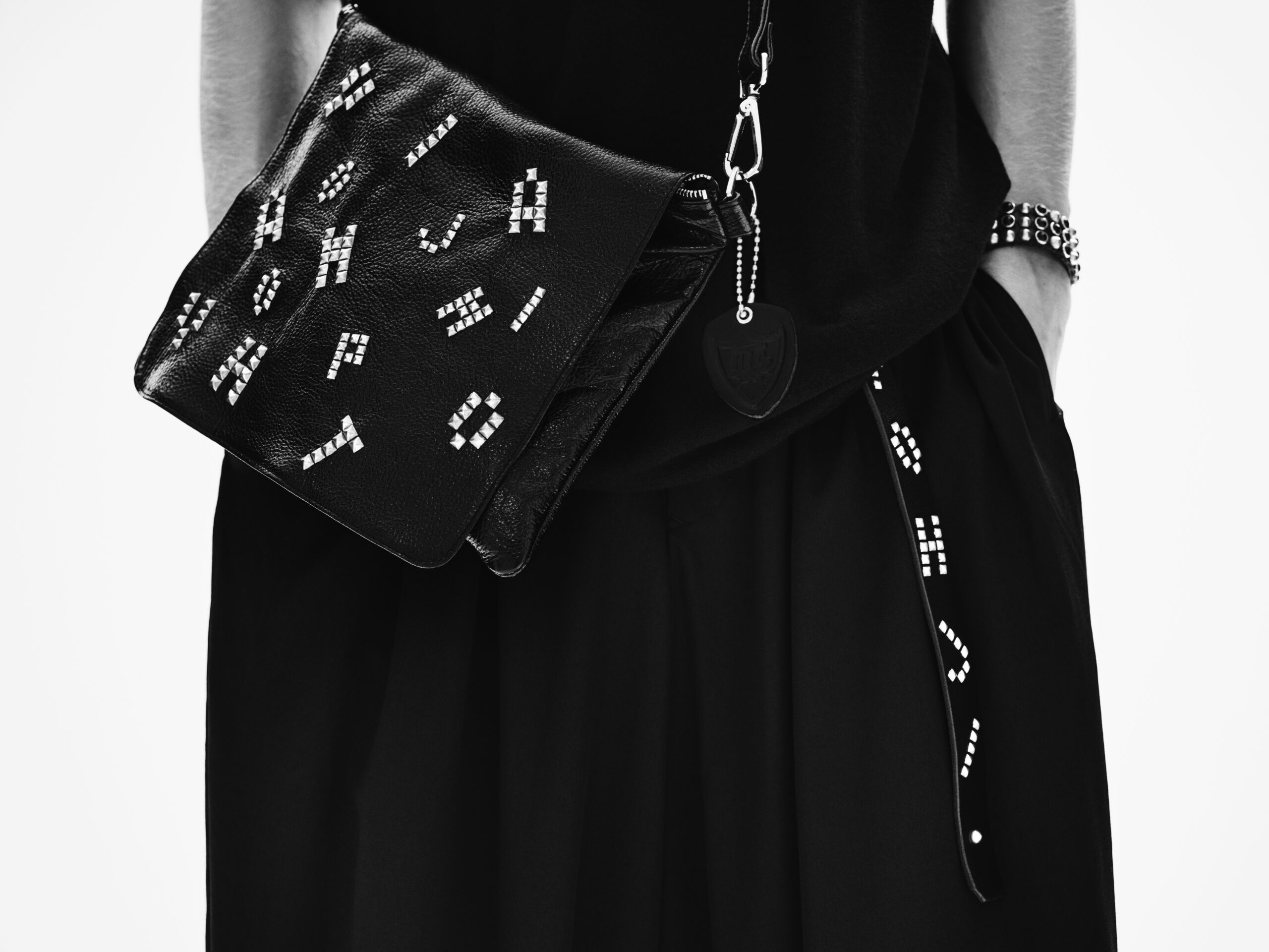本コレクションでは、トラッカー型デニムジャケットに手作業によるスタッズワークで“YOHJI”の文字を表現。また、ウールギャバジン素材のジャケットとパンツによるセットアップにもHTCの装飾加工を施し、1点のみのエクスクルーシブアイテムとして制作しています。熟練職人の手作業によって生まれる個体差や温かみのある表情が魅力です。また、スタッズショルダーバッグ、スタッズベルト、スタッズブレスレットなどのアクセサリーも展開しており、ヨウジヤマモトのデザインとHTCの職人技が融合した特別なラインアップとなっています。