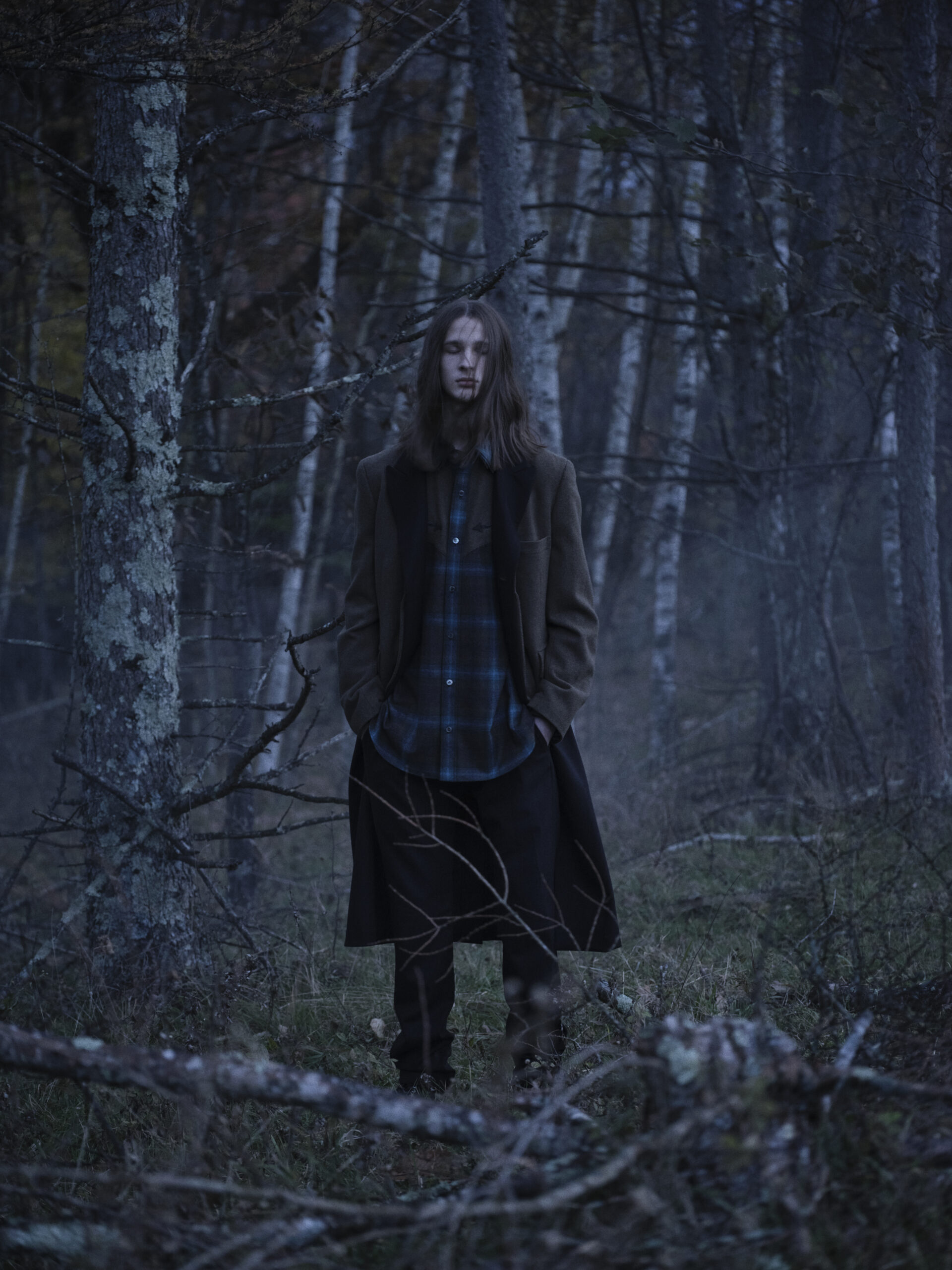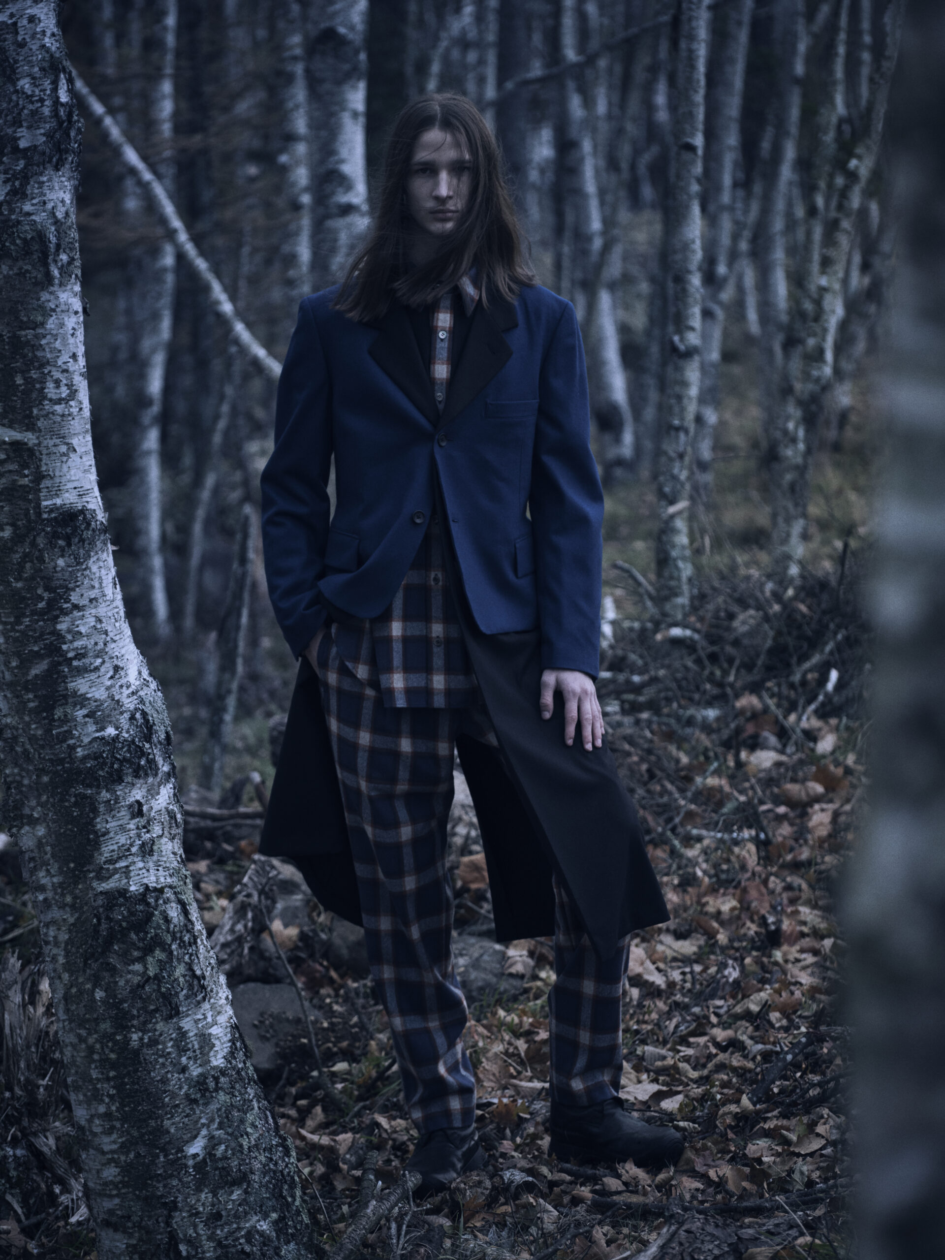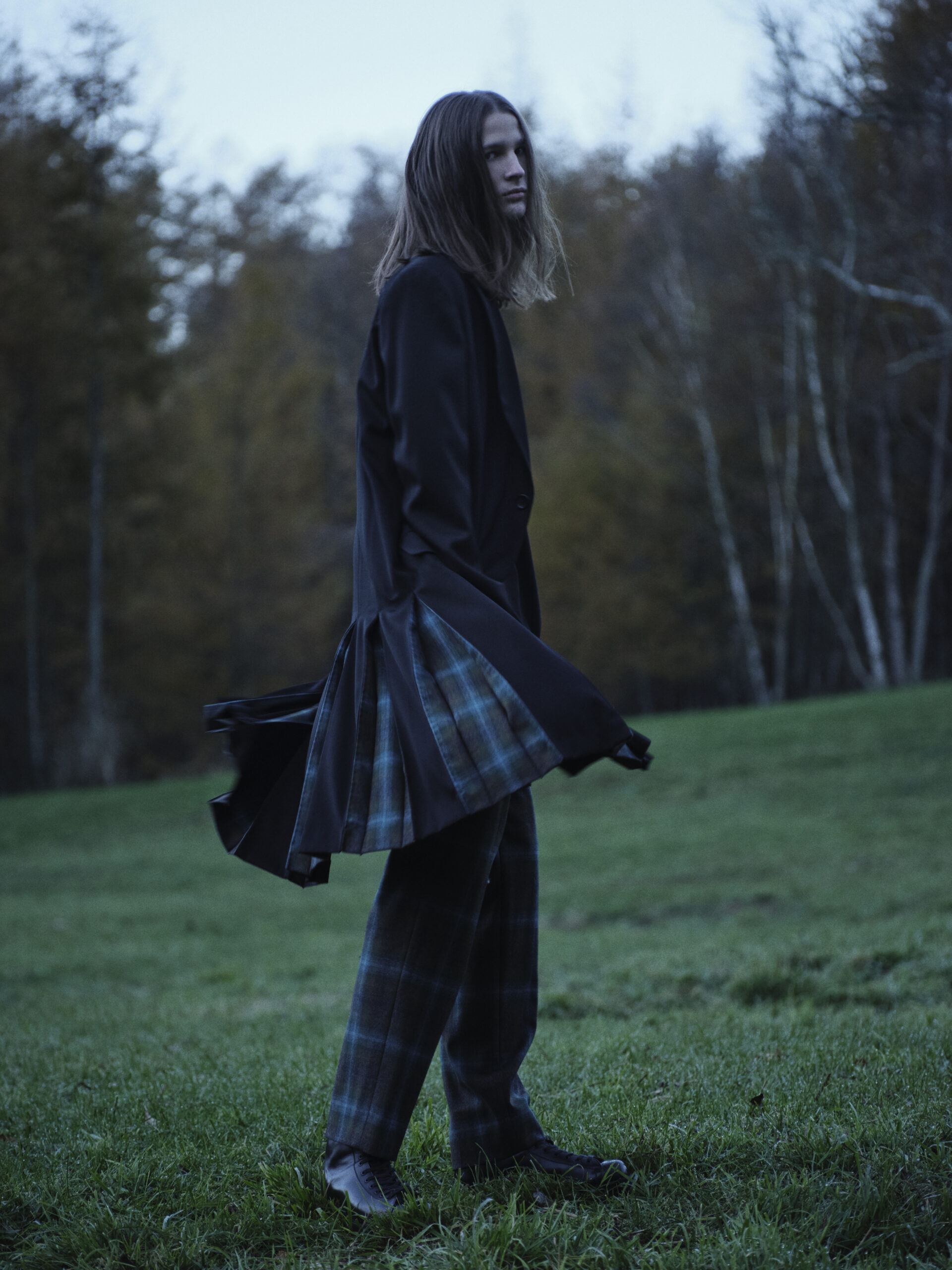 本コレクションでは、Yohji Yamamoto POUR HOMME 2008‑09AWランウェイに登場したチェック柄アイテムを再構築し、ジャケット、シャツ、パンツを展開します。ブランケットのように贅沢にチェック生地を用いた分量感のあるストールジャケットや、レイヤード構造のジャケット、プリーツ部分にチェック生地を縫い込んだジャケットなど、ロング丈のジャケットに細身シルエットのパンツを組み合わせています。希少なUSメイドのペンドルトンチェック生地のオーセンティックで温かみのある表情を、ヨウジヤマモトならではのシルエットやデザインと組み合わせ、新たなスタイルとして提示します。