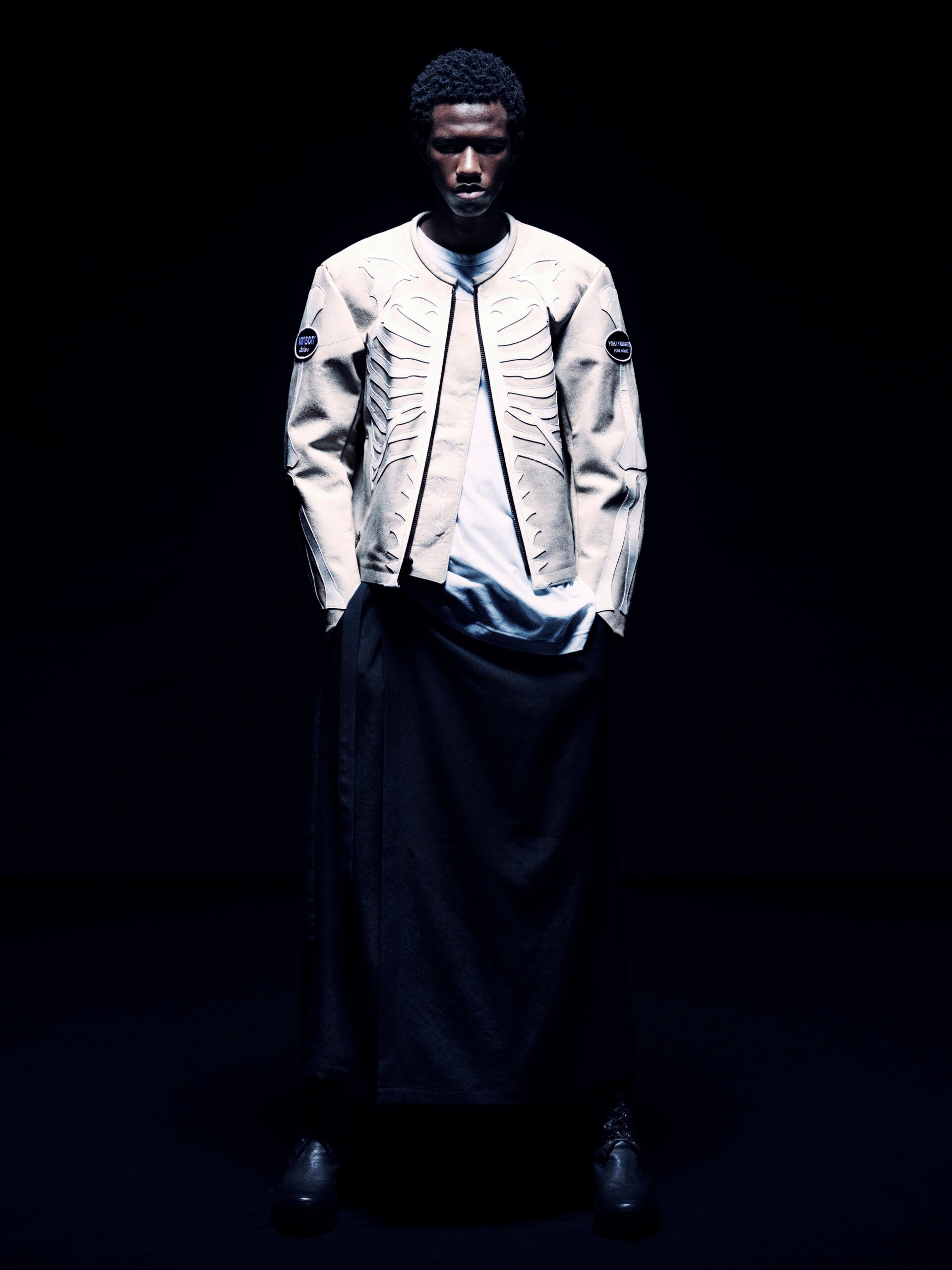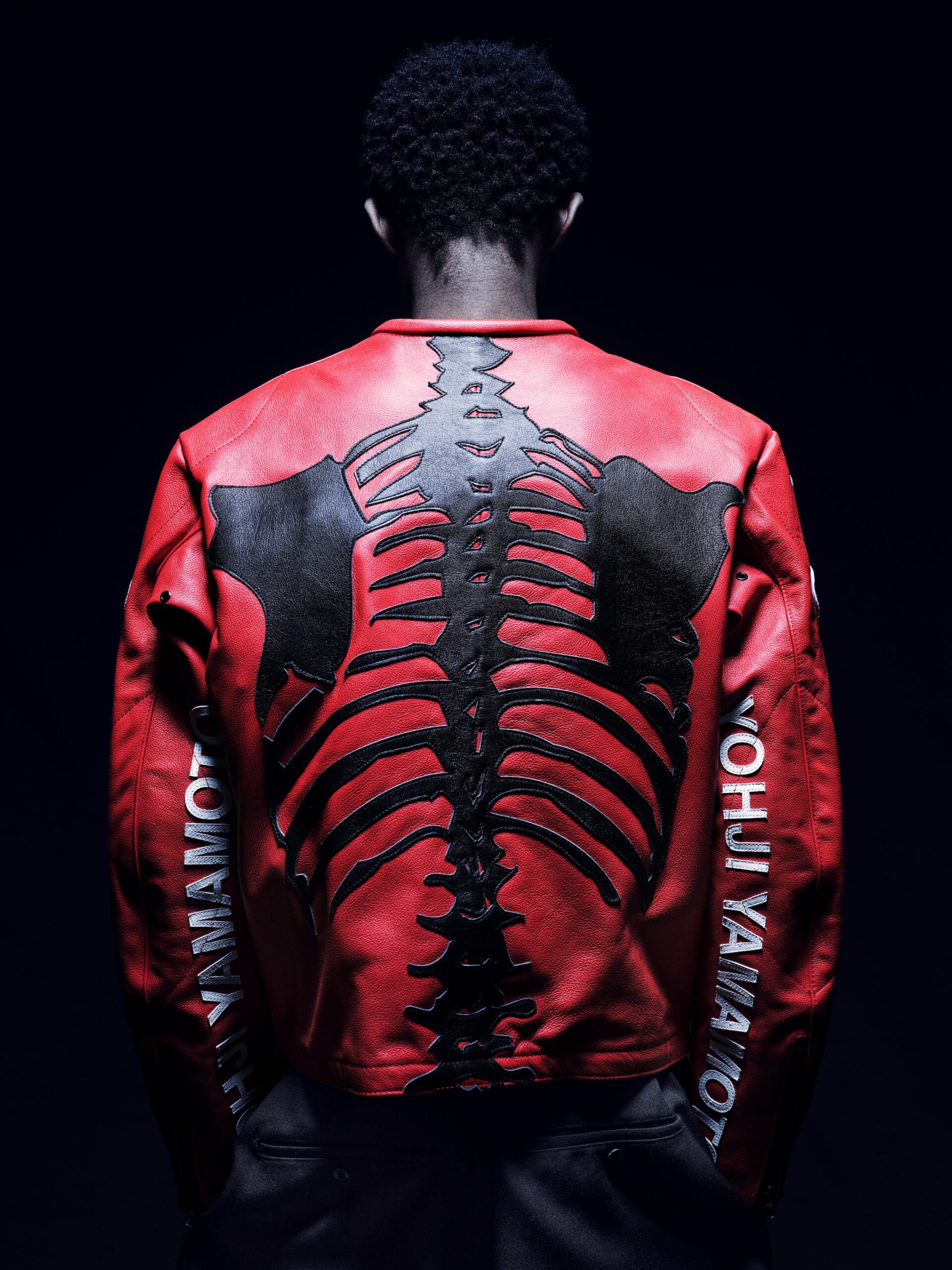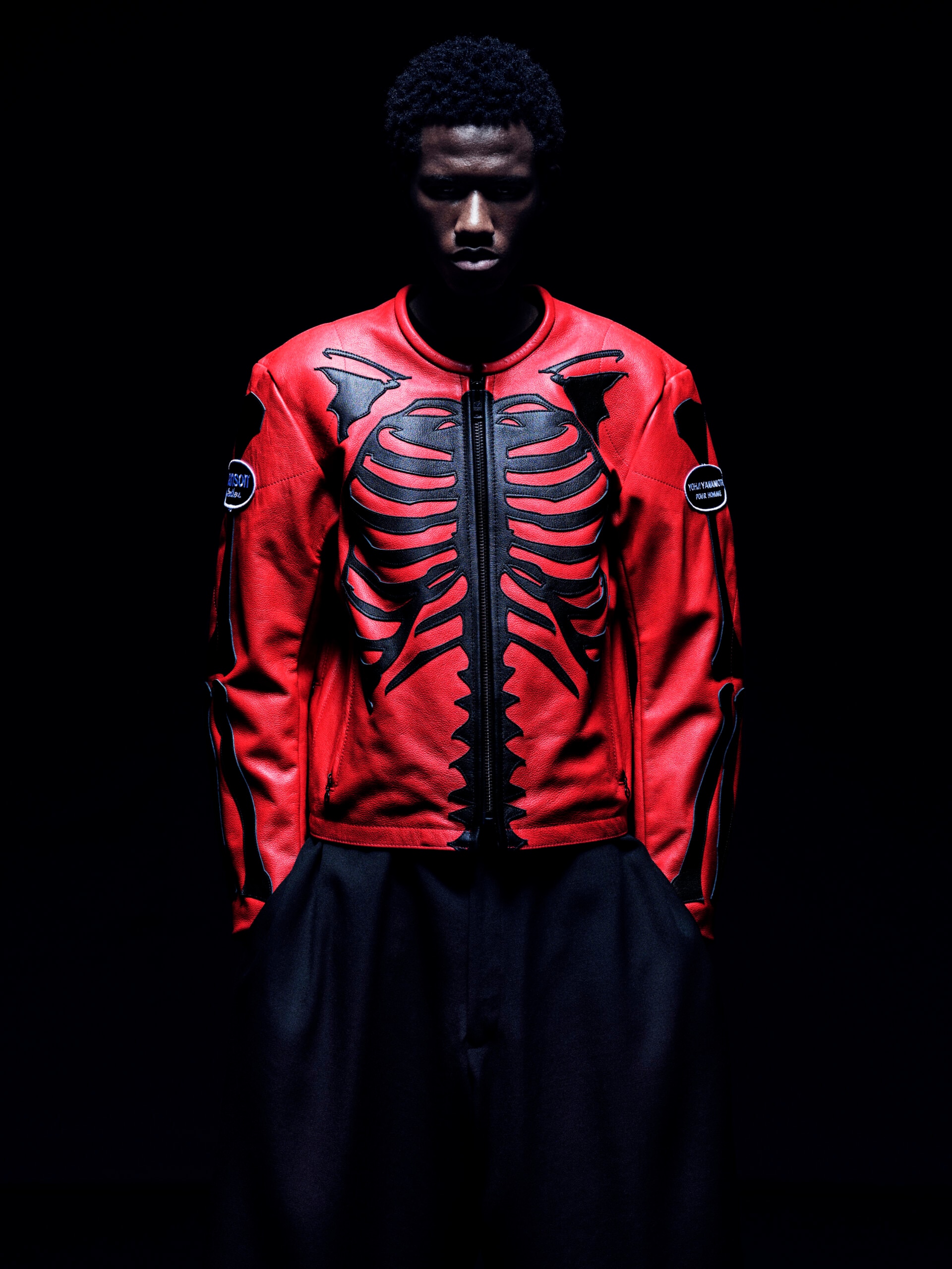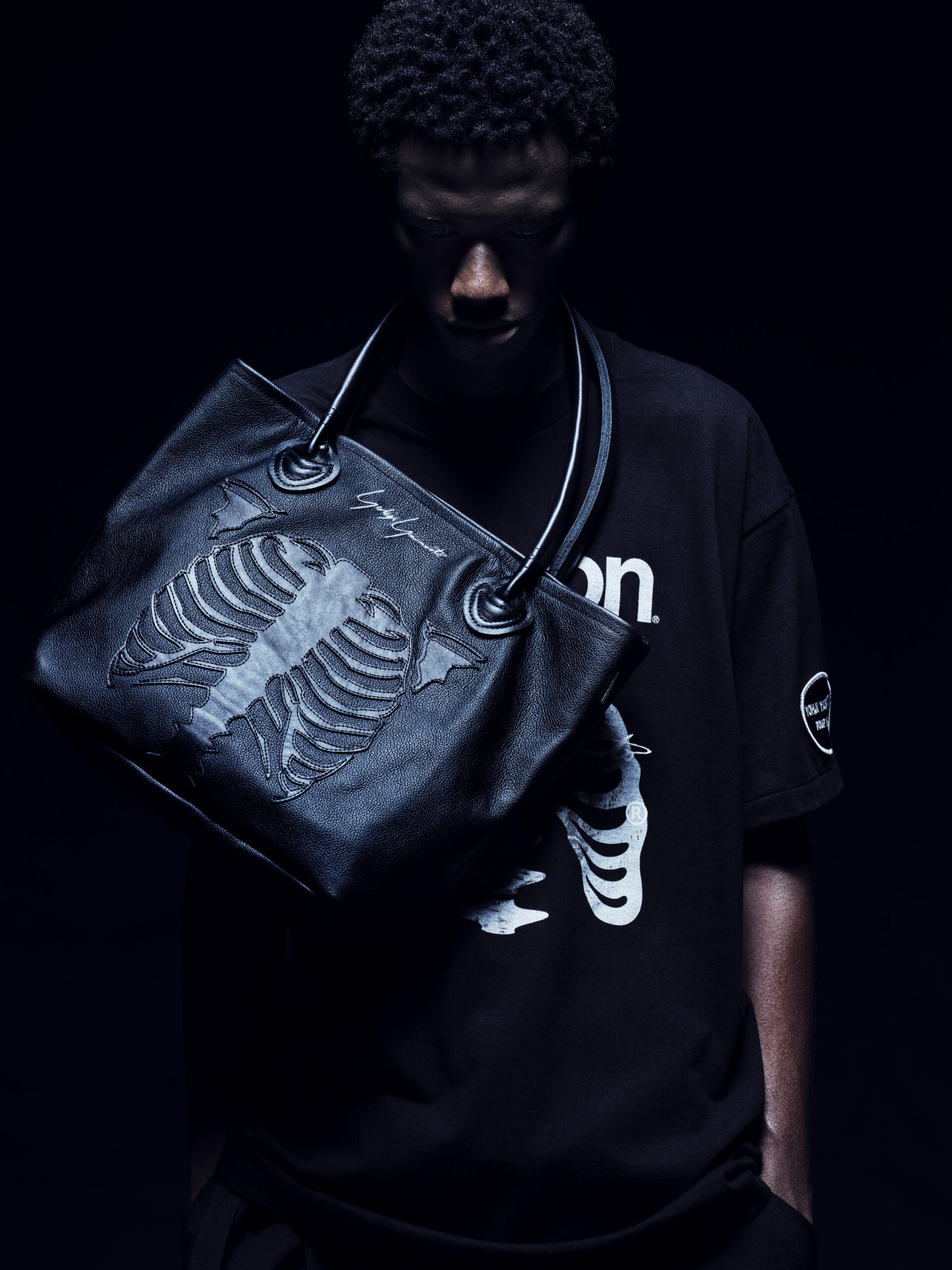 本コレクションでは、VANSONのクラシックなプロダクトをベースに、BONEデザインをYohji Yamamoto POUR HOMMEの視点から再構築したジャケット、バッグ、グローブを展開します。ジャケットはシングルライダースに立体的な骨モチーフのダブルレザーパネルを配置。カラーレスデザイン、フロントジップ、バックル、外ポケット、スリーブ肩位置のオーバルワッペンなどVANSON伝統の仕様を採用しています。BONE柄のトートバッグは、ハンドルの長さを調整し、フロント・バックパネルやレザーパッチの配置を変更した特別仕様。いずれのモデルにもBONEグラフィックとYohji Yamamotoのネームを施しています。ジャケットをご購入いただいた方には、限定ノベルティーとして、BONE TEE SHIRTをご用意しています。