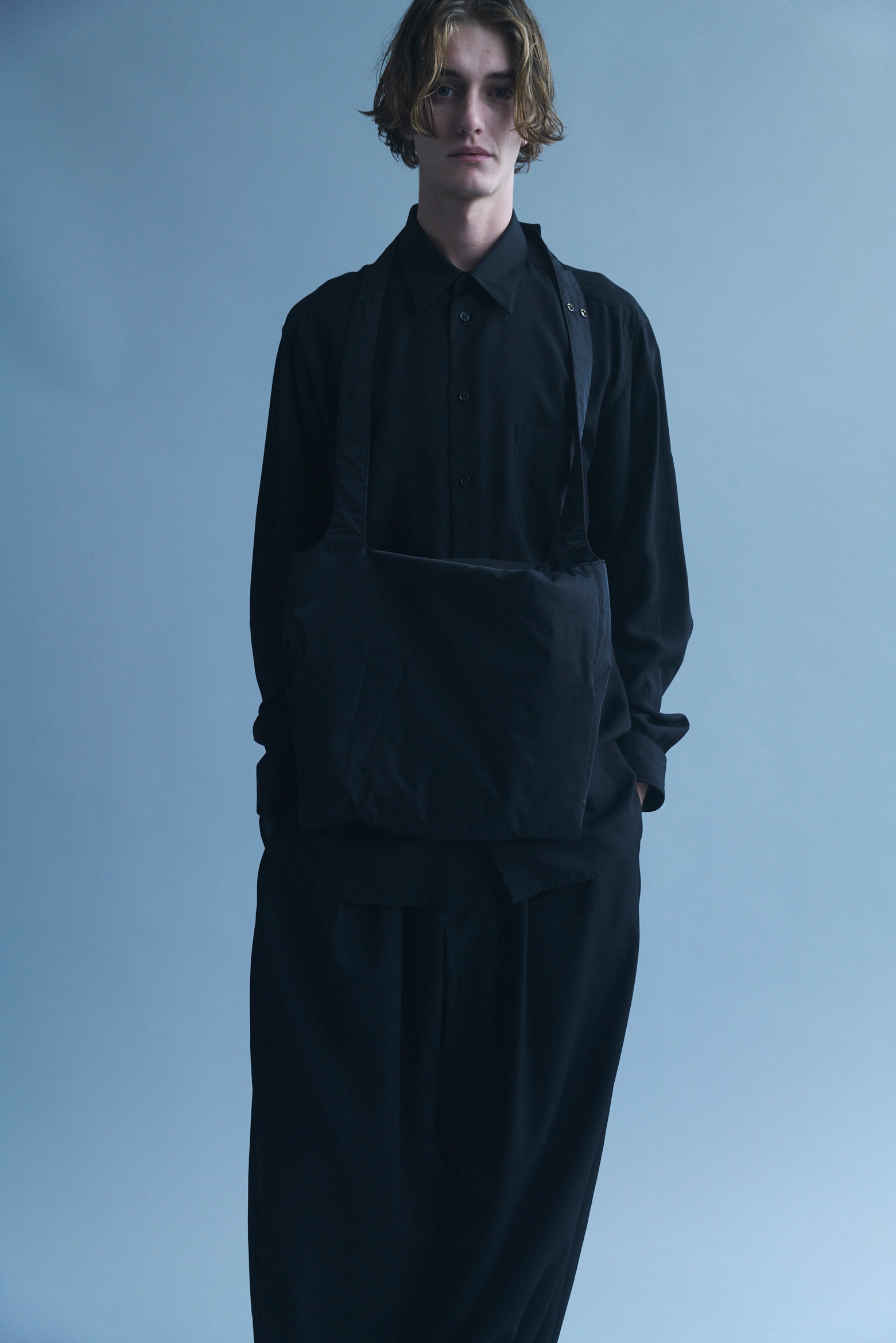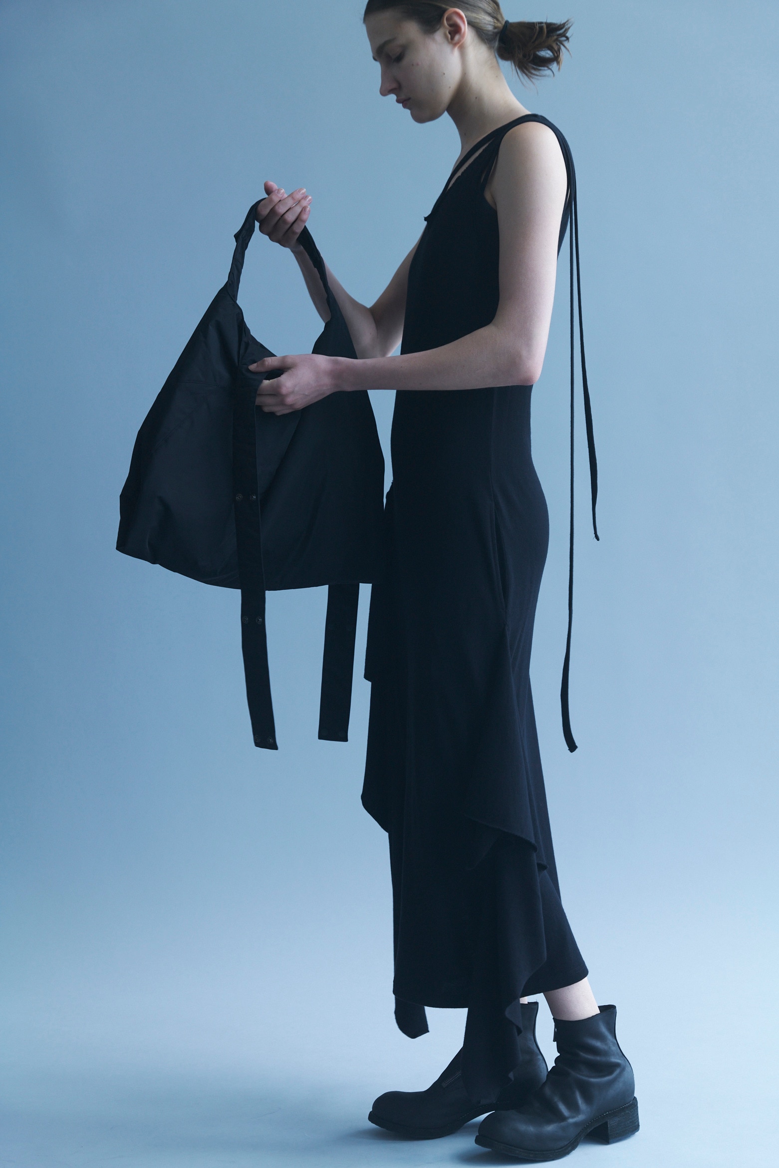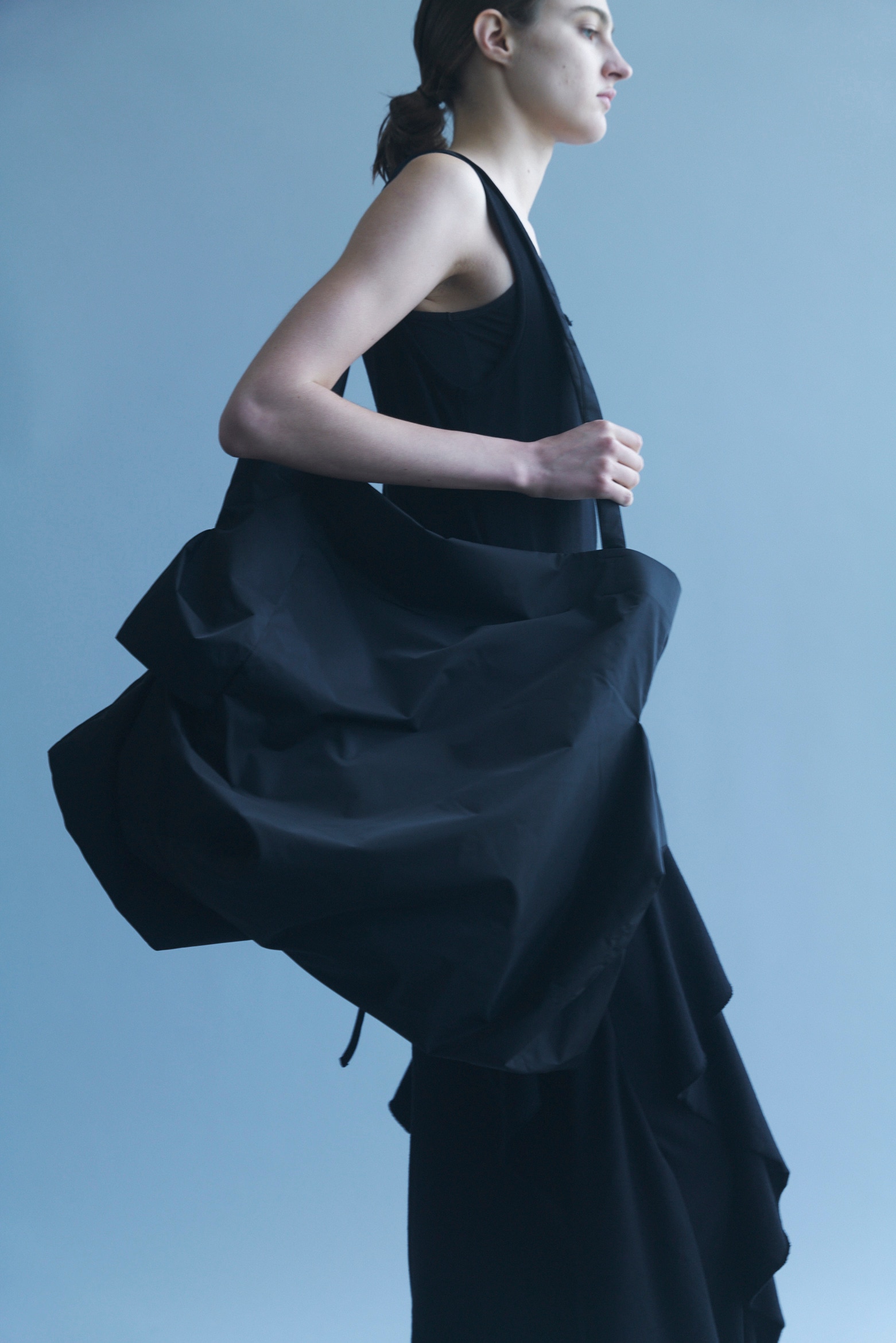 いずれも長方形の型紙のみで構成され、マチやタックの入れ方によって、異なるフォルムを描き出す。discord Yohji Yamamotoが追求してきたドレープや非対称の美学を、それぞれのかたちで体現したコレクション。