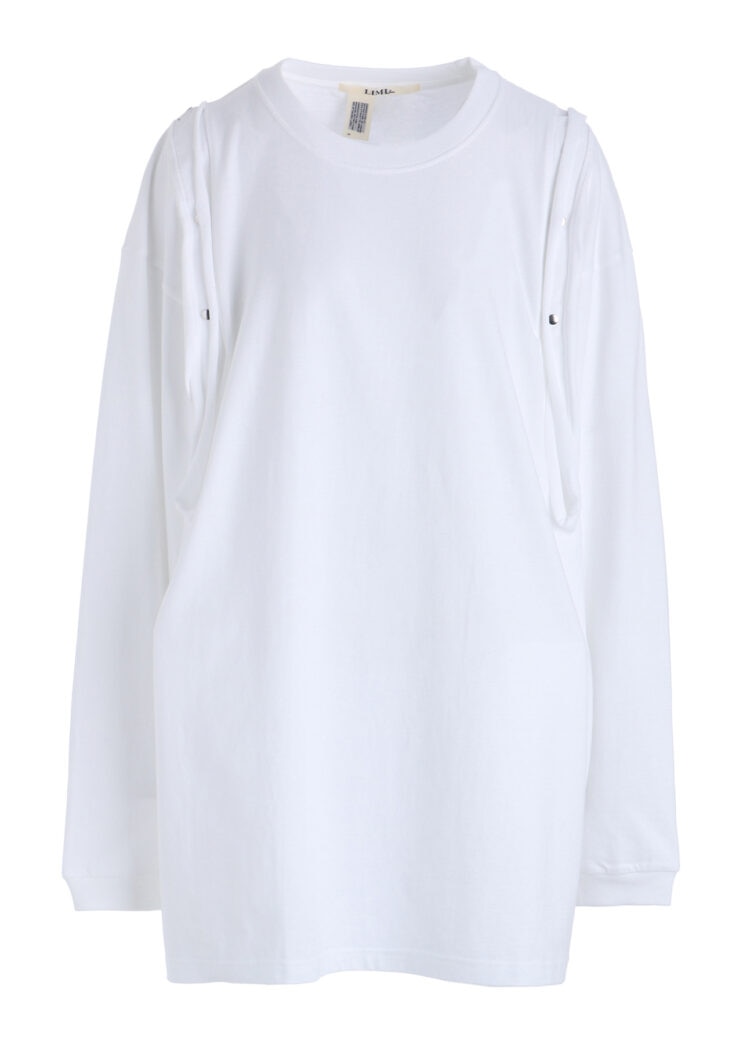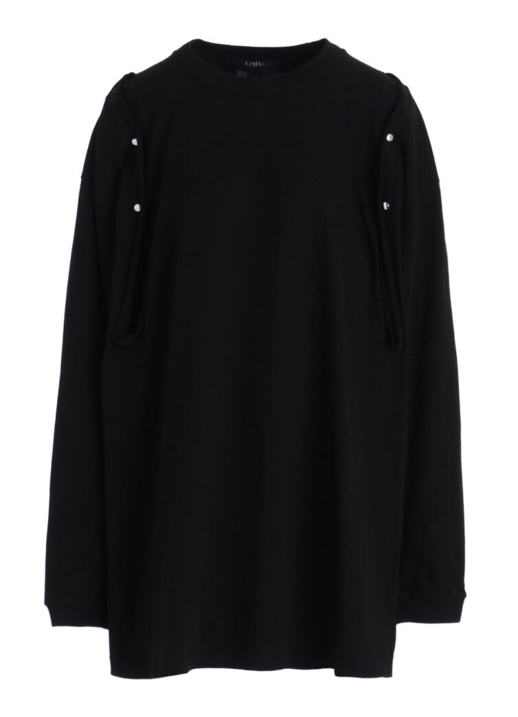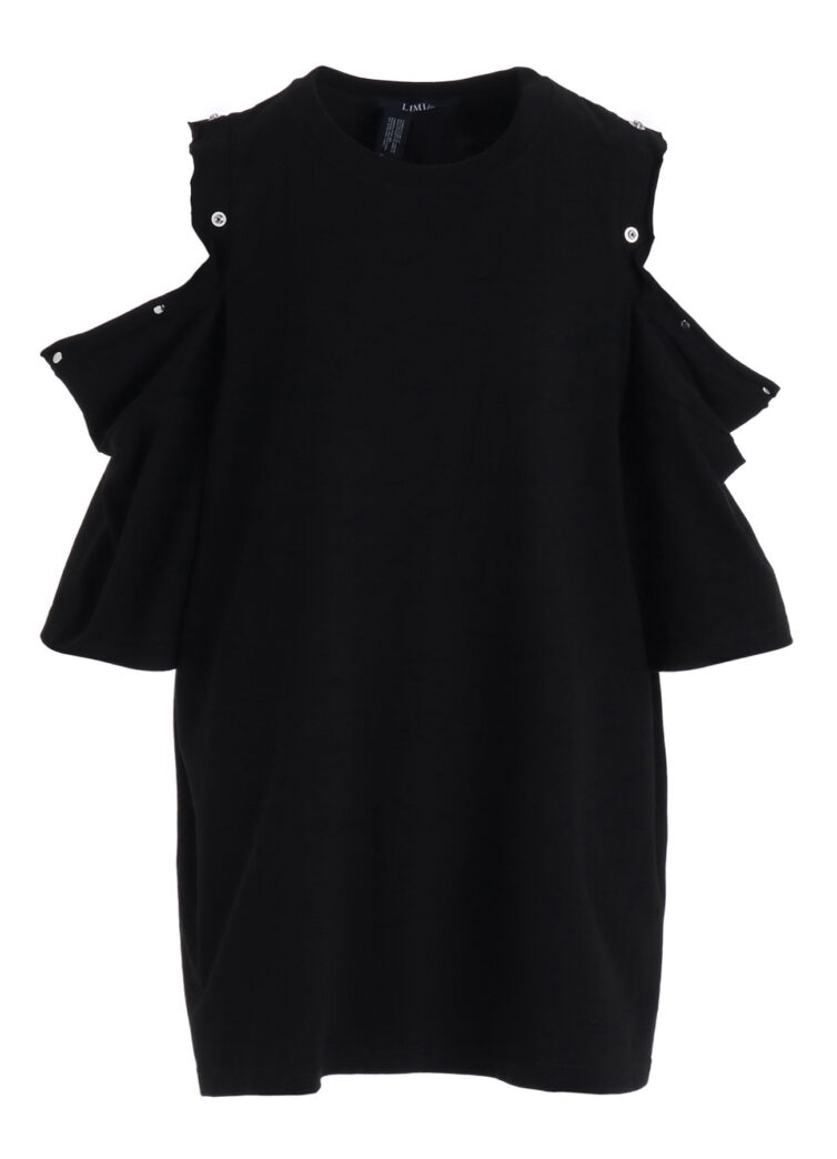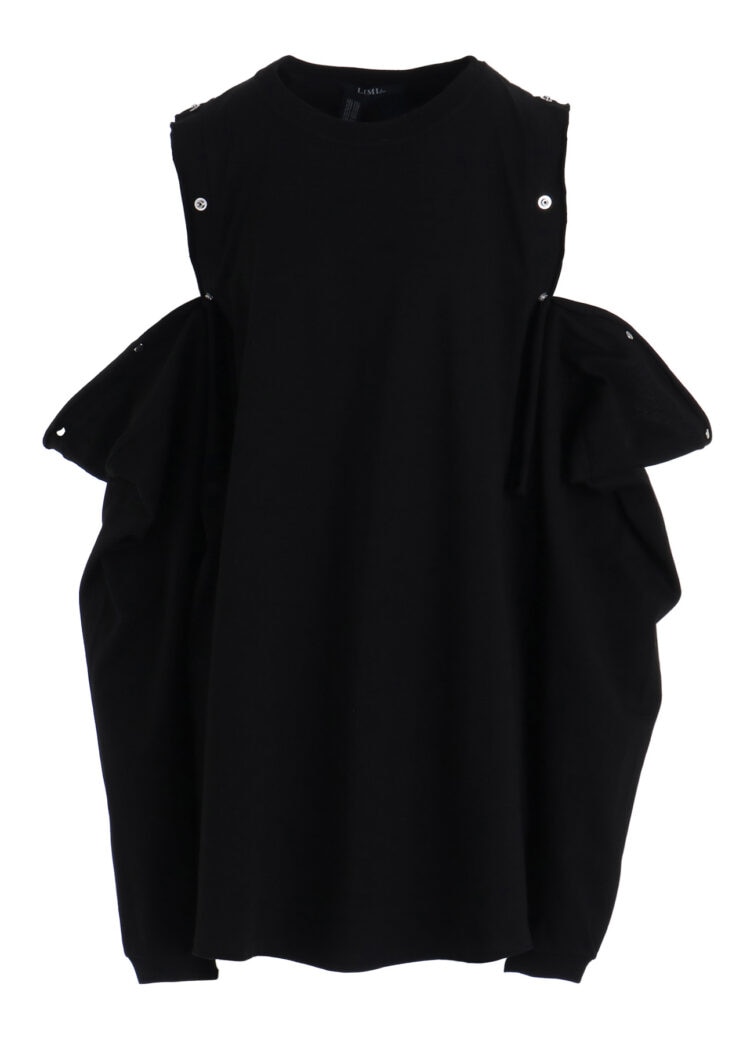 本シリーズでは半袖と長袖2型を、ブラック、ホワイトの2色で展開。いずれも肩に配されたスナップボタンを開閉することで、シルエットやバランスの変化をもたらすデザインが特徴です。背面の首元には、炎を想起させる「LIMI feu」ロゴがプリントされ、アクセントを添える。