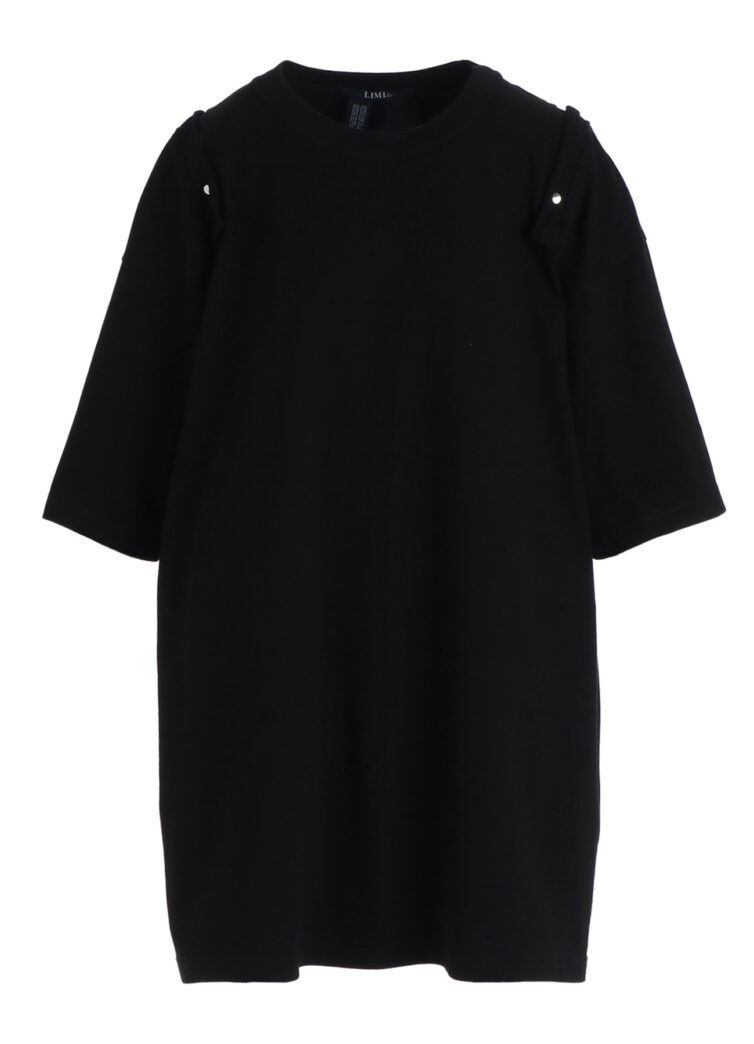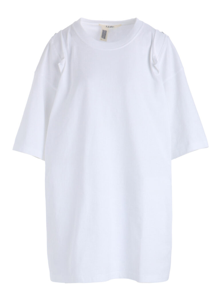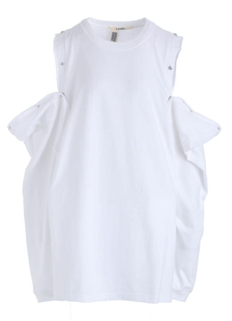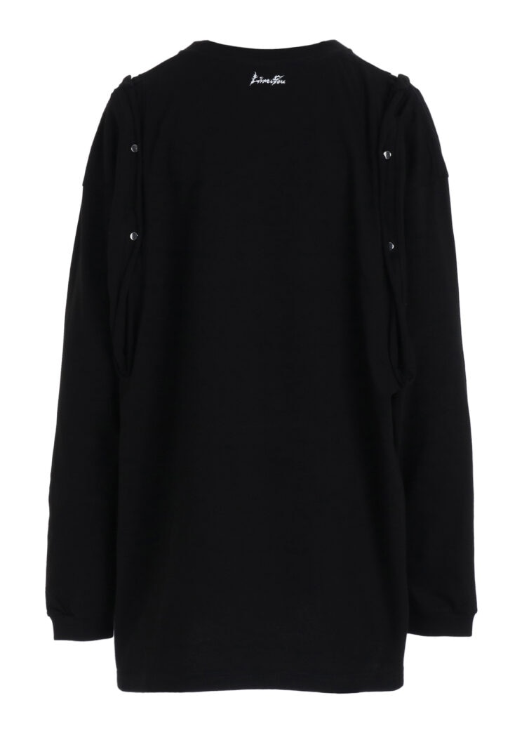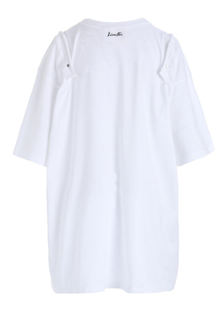 本シリーズでは半袖と長袖2型を、ブラック、ホワイトの2色で展開。いずれも肩に配されたスナップボタンを開閉することで、シルエットやバランスの変化をもたらすデザインが特徴です。背面の首元には、炎を想起させる「LIMI feu」ロゴがプリントされ、アクセントを添える。