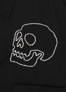 今回は、1色の生成りの糸で手縫いのようなジグザグステッチを施し、花とスカルをモチーフにした2型のシャツが登場します。 花の葉先からしずくがこぼれるように糸を垂らした繊細なデザインと、アシンメトリーに配置されたスカルモチーフが印象的なデザインを展開。どちらも刺繍の立体感を出さず、あえて平面的に仕上げることで、ステッチのラインが際立ち、遊び心のある独自の表情を引き出しました。