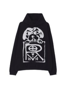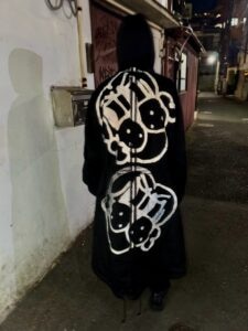 Tシャツ、フーディーにはCHITOのシグネチャーである”pup”グラフィックをフロントに配置しました。ラフなスプレータッチで描かれた”pup”の表情と黒のミニマルなベースが鮮やかなコントラストを生み、ストリートアートの即興性とユーモアが共存するCHITOの世界観を、日常に取り入れられるアートピースとして昇華した一着です。