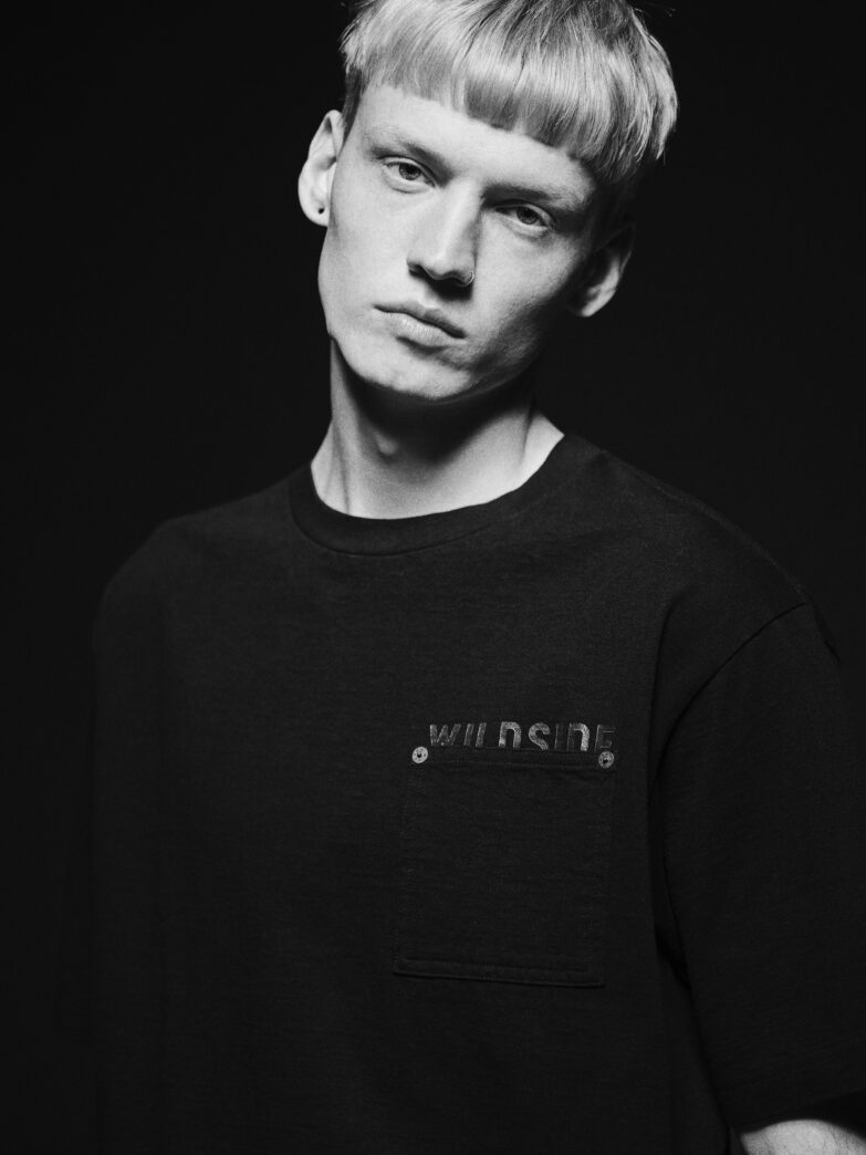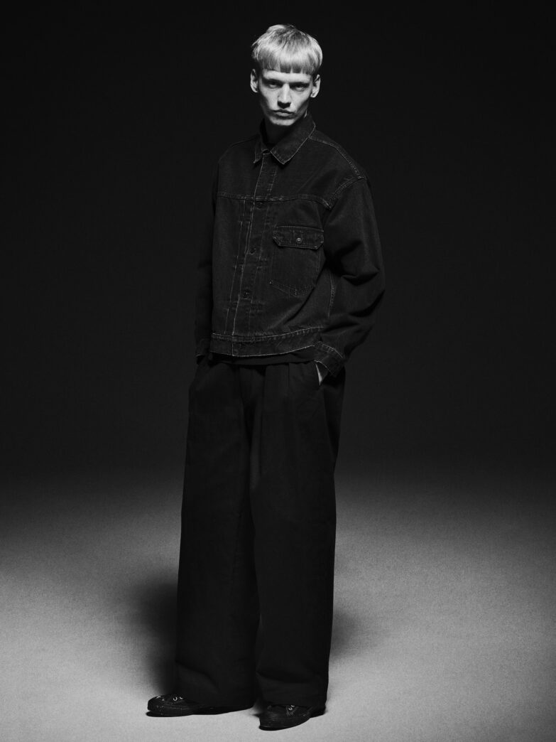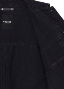 今回の新作では、 WILDSIDEを象徴するブラックにカスタムしたファッションアイテム4型が登場します。ファーストタイプをベースとしたトラッカージャケットは、より深みのある黒を追求し、糸の染色工程からこだわり抜いたMINEDENIMオリジナル12ozブラックデニムを採用。ヴィンテージライクなUSED加工を施し、ルーズなシルエット、クラシカルなディティールデザインに仕上げました。Tシャツには、武骨な表情を持つミディアムオンスのオリジナルブラックボディにスクエアポケットを配置し、ジーンズを模したダブルステッチや補強用のリベットはMINEDENIMオリジナルのものを使用するなど、デニムらしさを表現しました。パンツ2型には、株式会社ヨウジヤマモトのオリジナル生地、ウールギャバジンとコットンカツラギをそれぞれに使用。フロント2本の深いタックを配し、ゆったりとした腰回りから裾にかけて強めのテーパードをかけた特徴的なシルエットを実現しました。ブラックを基調とした両ブランドの世界観が融合した特別なコレクションです。