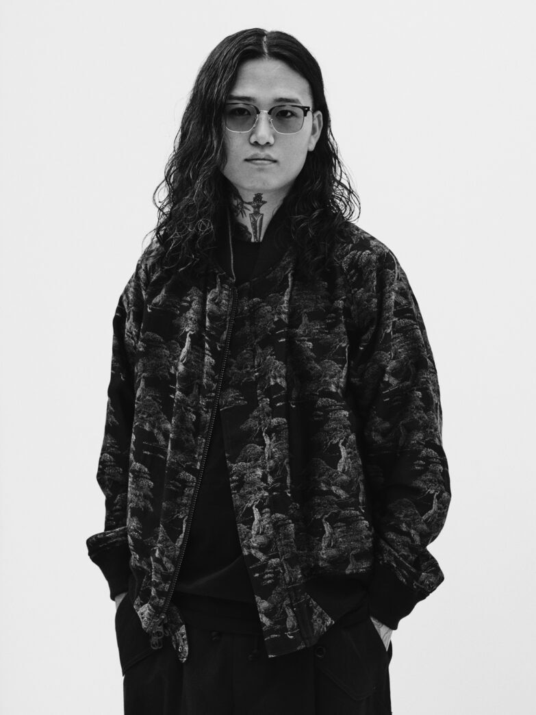 リバーシブルブルゾンは、背面に五葉松模様木-銘「501」をグラフィカルなデザインに変え、モノトーン調で大胆に刺繍を施しました。裏地には、五葉松、黒松、真栢模様木といったTRADMAN’S BONSAIが誇る名株をコラージュし、ジャガード織によって構築された総柄で、一見迷彩柄のようにも映るユニークなテキスタイルデザインに仕上げています。