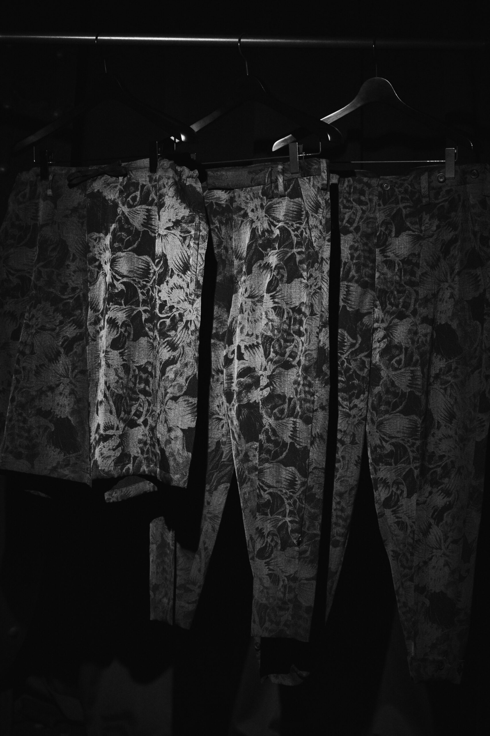 また、タイガーオーキッド柄を抜染で表現したウールギャバジンのジャケットとパンツを展開いたします。黒地に浮かび上がる花柄が、濃淡によって奥行きのある表情を生み出しています。