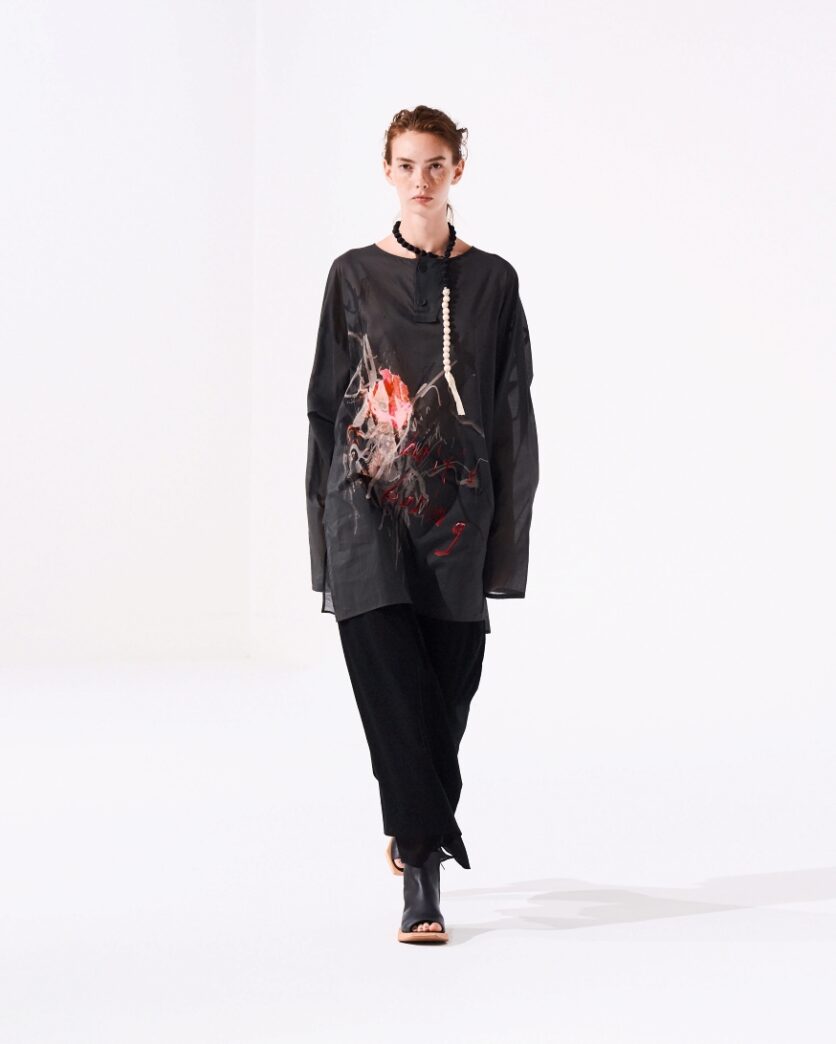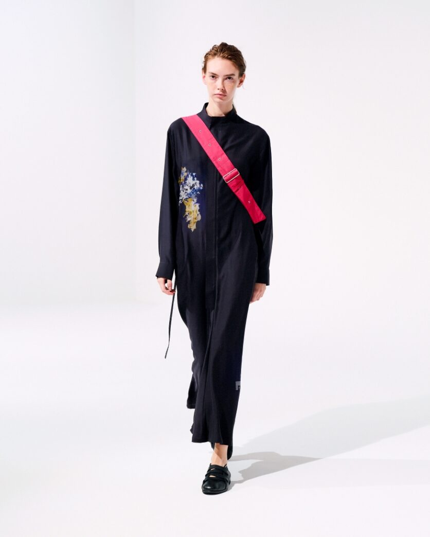 ゆったりとしたロングシルエットをベースに、フロントのフレアと後身頃のギャザーで動きを加えたドレス。不完全な花のモチーフと「Perfection is ugly」のメッセージが遊び心ある哲学的な表情を漂わせる。L17