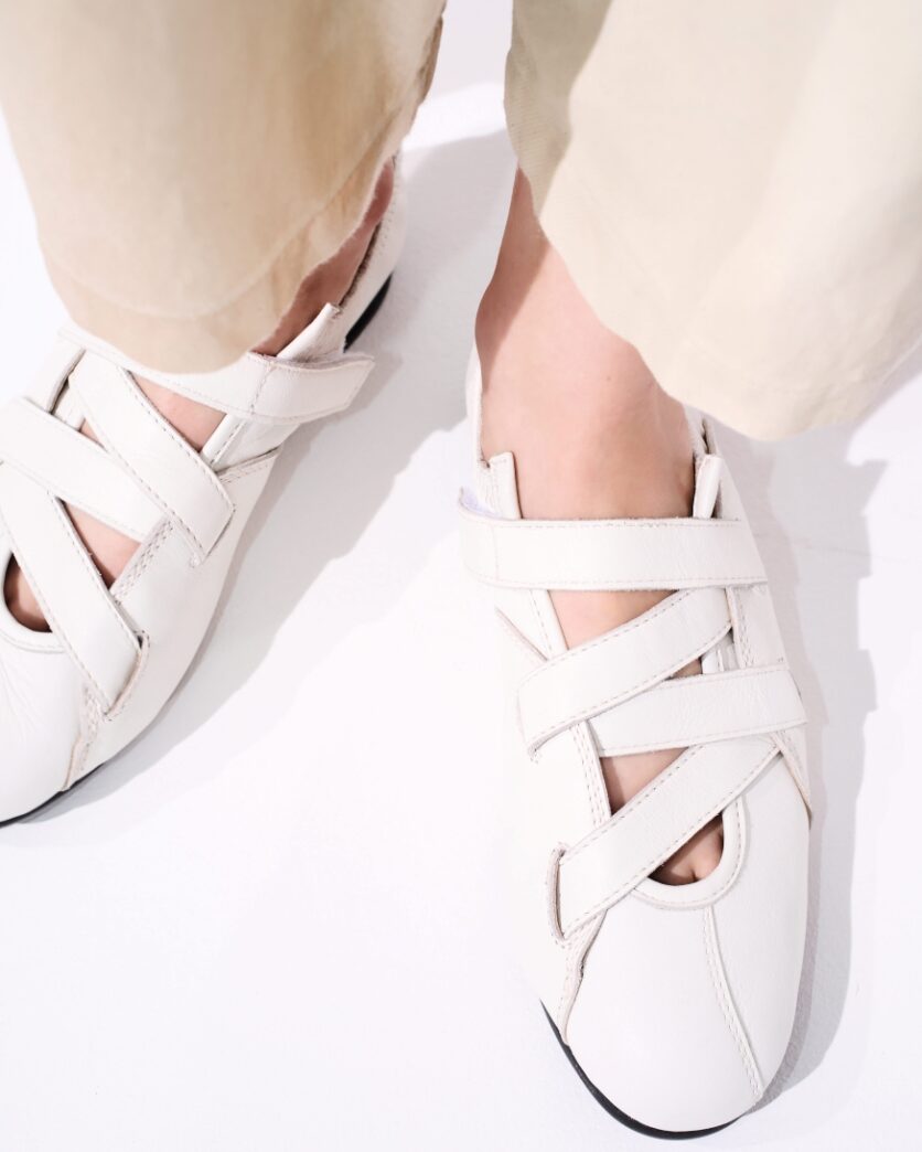 箔を施したデニムのジャケットとワイドパンツ。光沢と質感のコントラストが印象的な立体的なスタイル。スニーカーとバレエシューズを融合させたフラットシューズがリラックス感のあるムードを添える。L19/L20