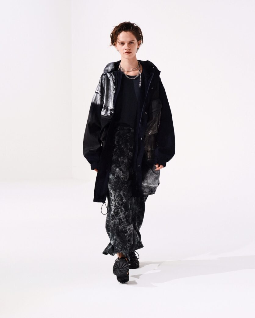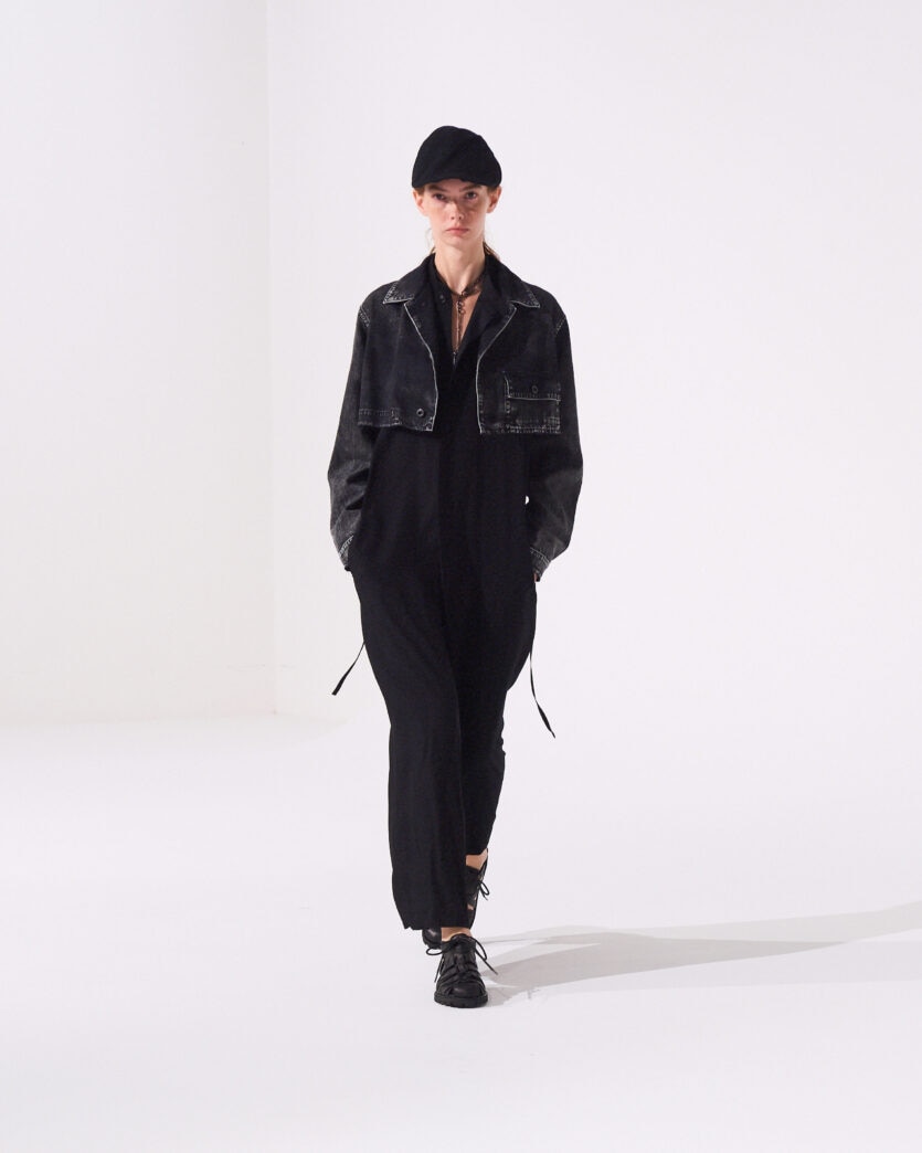 大きなポケットが特徴のオーバーサイズブルゾン。あえてラフに仕上げた表情が、軽やかなフォルムを引き立てる。デニムに箔を施し、光沢と質感のコントラストが際立つセットアップは、今シーズンを象徴する一着。L23