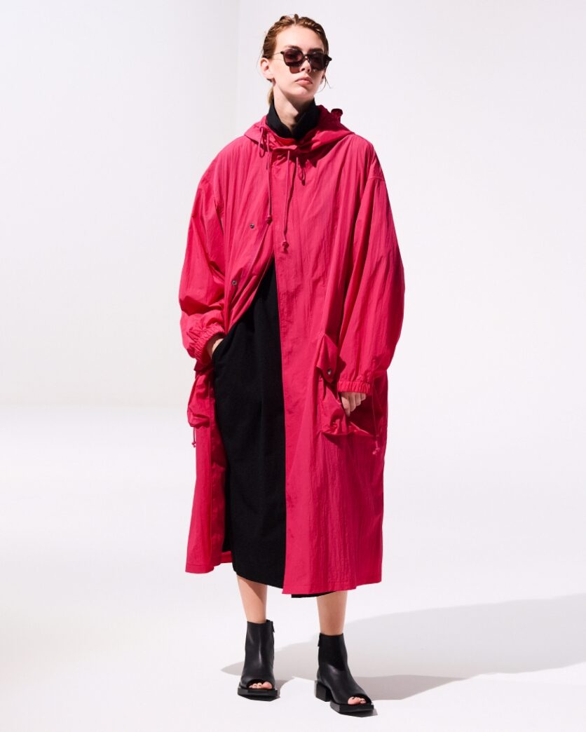 機能性に優れたナイロンコート、プリーツやテープを用いたスポーティなレイヤード、空気を纏うギャザースカート、ティアードドレス。