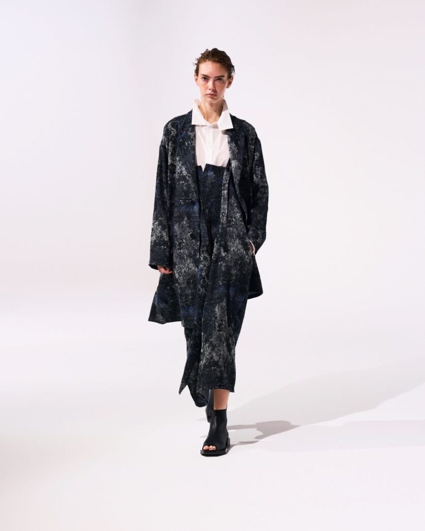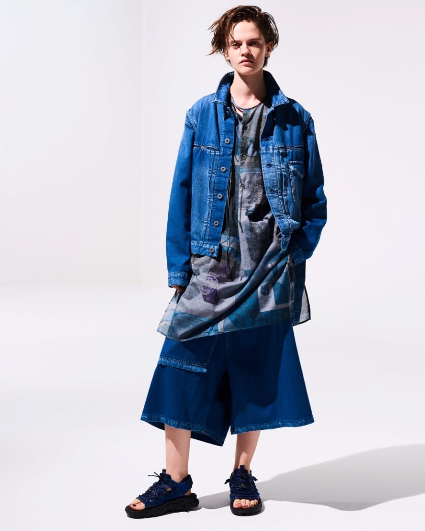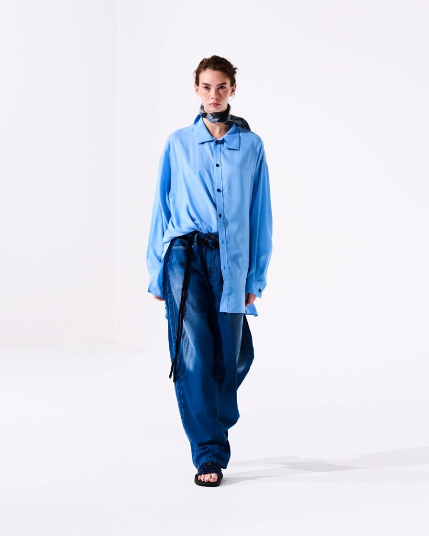 ビッグシルエットのブルーブラウスは、左右で異なるヘムの長さが生むリズムが特徴。インディゴデニムとの組み合わせで、軽やかさと存在感が共存するY’sらしい装いを提案する。L44