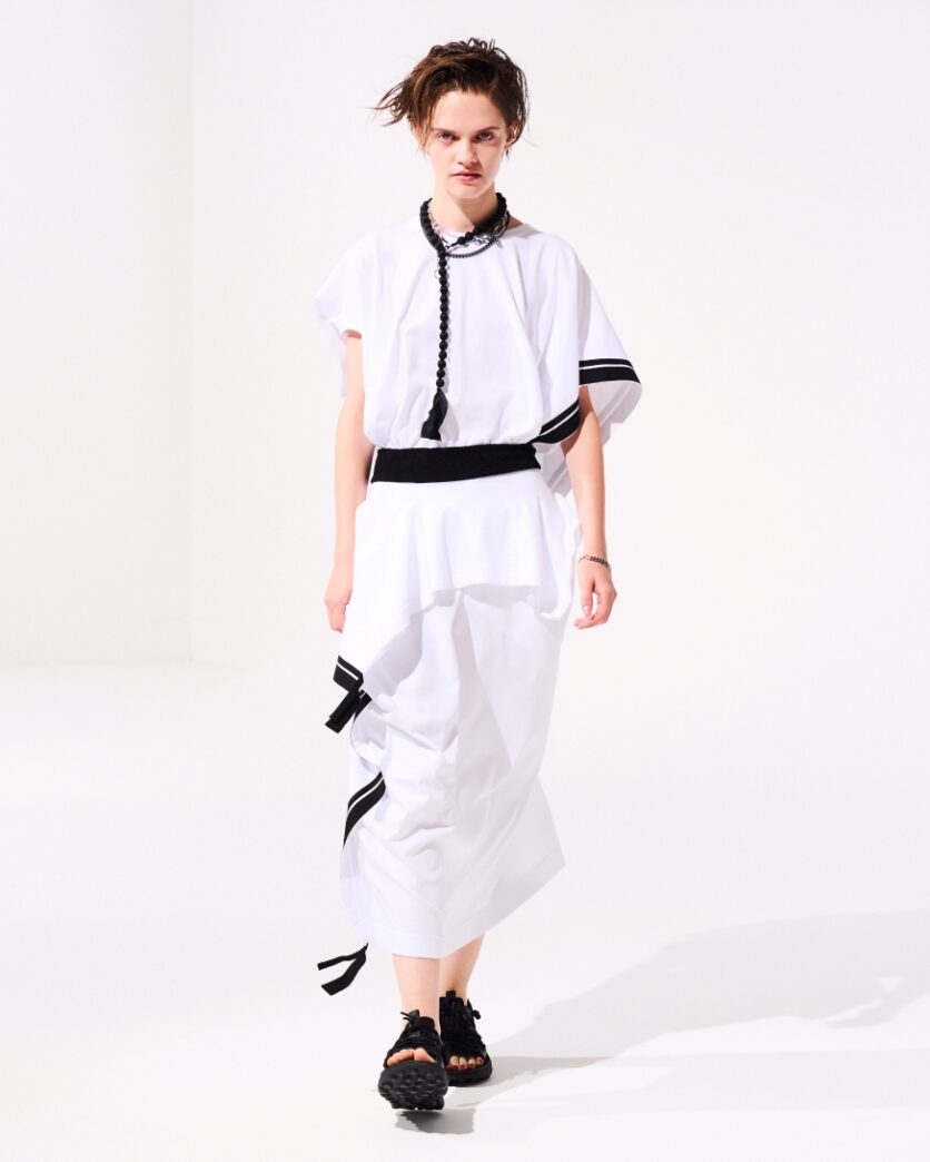 カットソー生地の素材感を活かし、接ぎのない丸胴で仕上げたプルオーバーとスカート。ラインテープやドレープ感が動きのある軽やかなシルエットを描く。L30