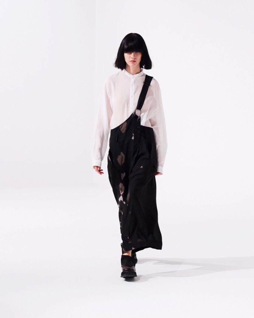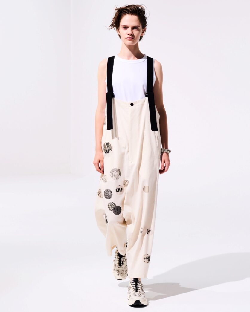 新聞紙や天使のモチーフをドット状に切り抜き再構築したオーバーオール型ペインターパンツ。柄の遊び心と構築的シルエットを両立させ、角度によって異なる表情を見せる。L50
