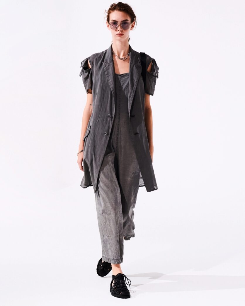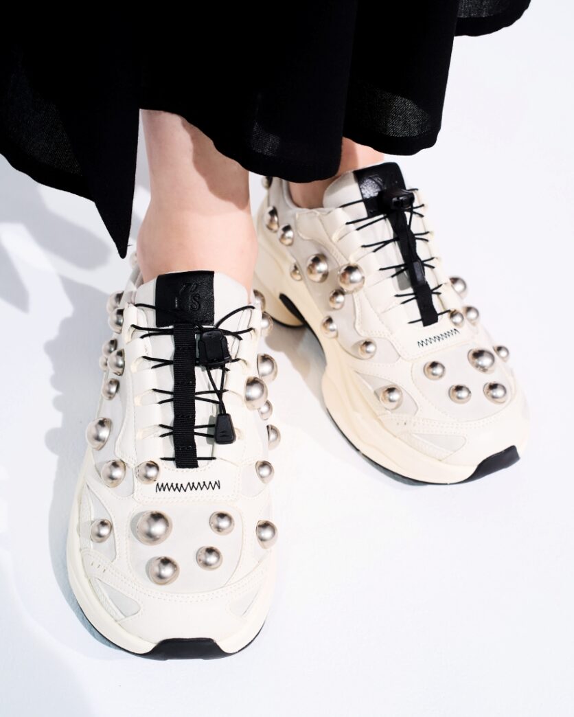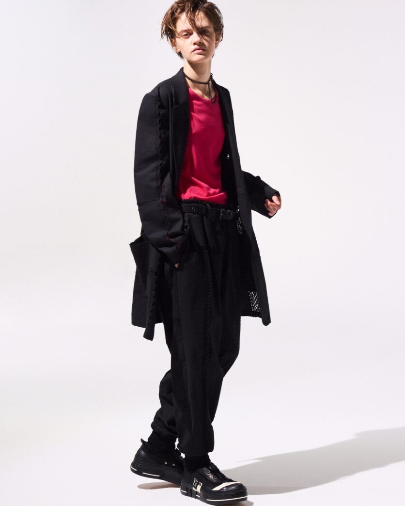 アシンメトリージャケットと、フラシで揺れるパンツを合わせた軽やかなコーディネート。スニーカーは半円スタッズを無造作に散りばめ、存在感を放つ。L37/L38