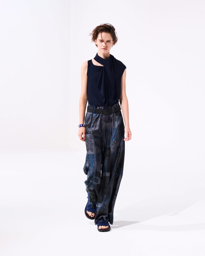 首にタイを巻くようにドレーピングしたランニングトップ。アンティークのツボをモチーフにしたロングストレートパンツと合わせ、さわやかで涼しげな印象に。L41