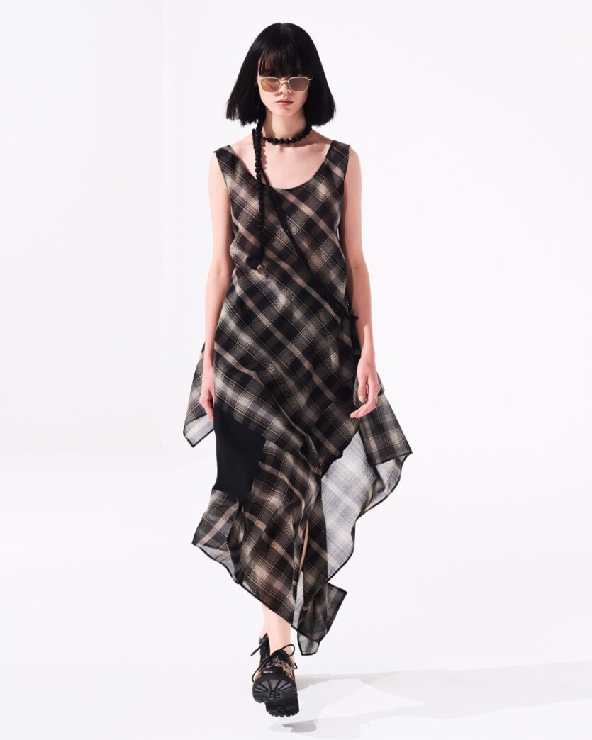 風を含むようになびくタンクトップと、直線的な布をアシンメトリーに重ねたスカートが、流れるシルエットを描く。ドレープの揺れがフェミニンな表情を引き立て、軽やかなチェック柄を纏う。L42
