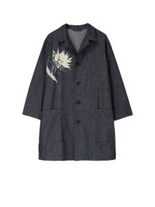 立体的なボリュームと温かみ、微妙な個体差のある手振り刺繍を施したウールギャバジンジャケット。刺繍は角度によって表情や色合いが微かに揺らぐ。アシンメトリーなシルエット。