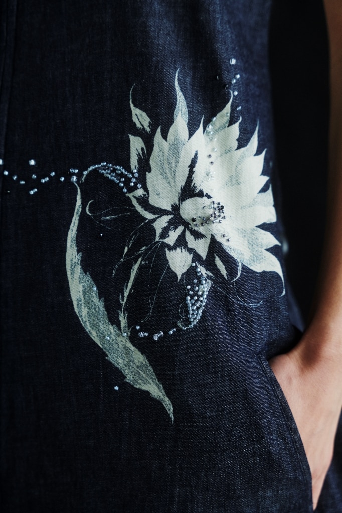 デニム生地にサボテンの花を抜染プリントし、柄に合わせてビーズが散らばるように刺繍を施した。