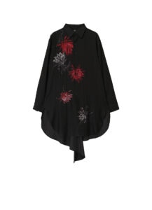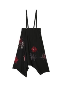 サボテンの花を不規則に配したブラウスとサスペンダー付きパンツ。光沢と落ち感のあるキュプラ素材に花のトーンの差や掠れ感が奥行きを描く。